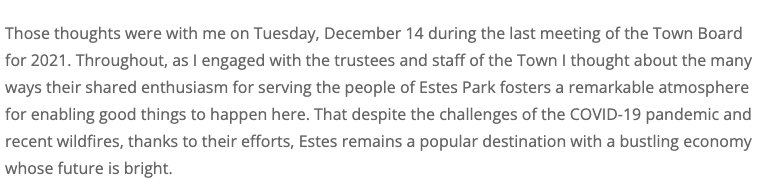 What we can thus expect from tonight's performance (pre-recorded, apparently) is that our mayor is going to engage with the trustees and staff, and will be thinking while engaging about the trustees' and staff's shared enthusiasm for serving the people of Estes Park. Let's hope nothing happens to prove this inaccurate, setting off a chain of reactions that include a butterfly crashing into a tree in Sao Paulo and the total unraveling of the fabric of the universe.